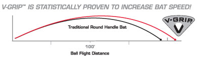 Without the proper grip, high-quality scientifically engineered bats alone do nothing to enhance swing performance. Place the V-Grip™ bat in your hands incorrectly by setting the bat back in the palm of your hand and then swing the bat. It will end up out in your fingertips where it should be placed to swing the bat. If you do the same thing with a round handle bat, it will stay in the back of your hand. In other words, if you try and swing the V-Grip™ bat incorrectly, it corrects itself and ends up in the proper position in your hands – the bat forces your swing to be efficient!